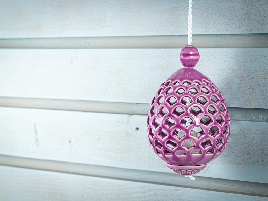 Ozdoba se popotáhne nahoru a na keramický komponent umístěný dole v mističce se nakape esenciální olej. Viz doplňkové fotografie.