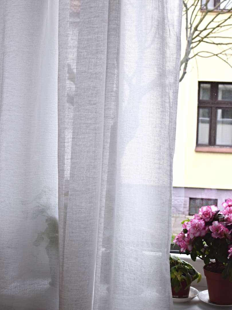 Záclona na fotografii je z bílého nebo z šedého jemného lnu o gramáži 80 g/m2. Látka je příjemně splývavá a průhledná. Záclona má na vrchu našitá poutka o rozměru 4x8 cm pro navlečení na tyč. Záclony klasicky zakrývají pohled zvenku dovnitř, ale je průhlednost ven.