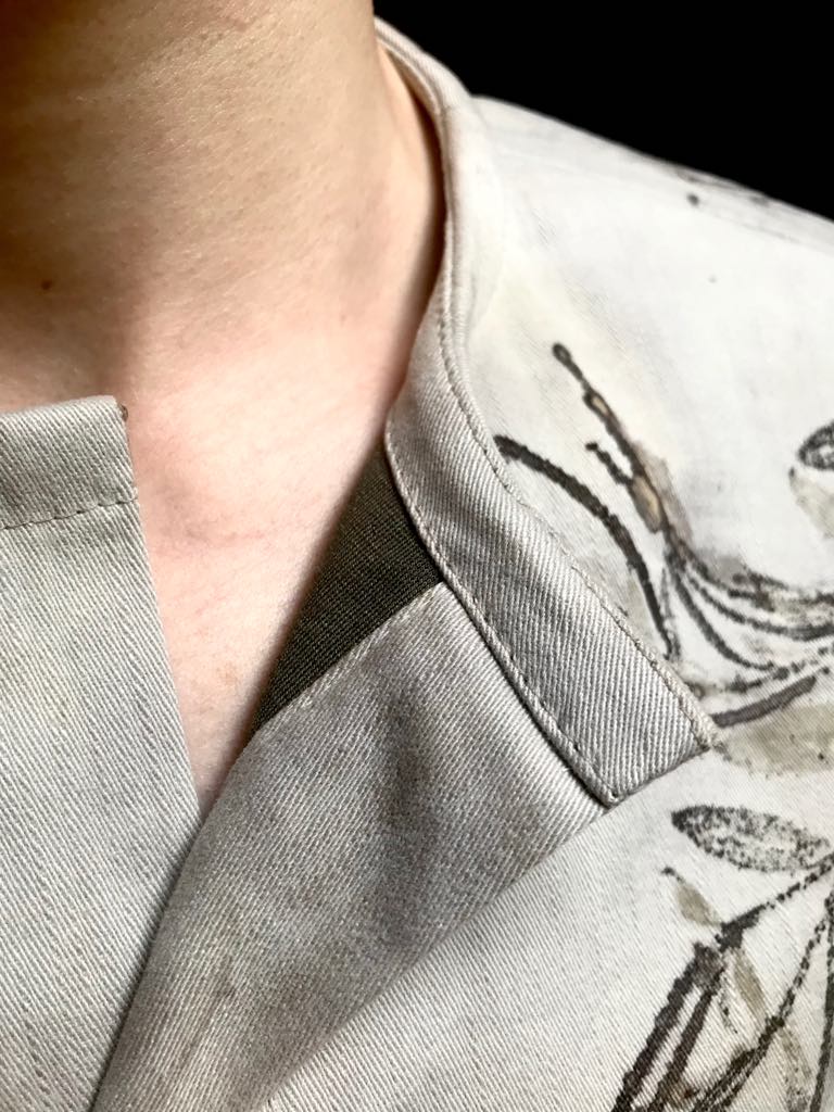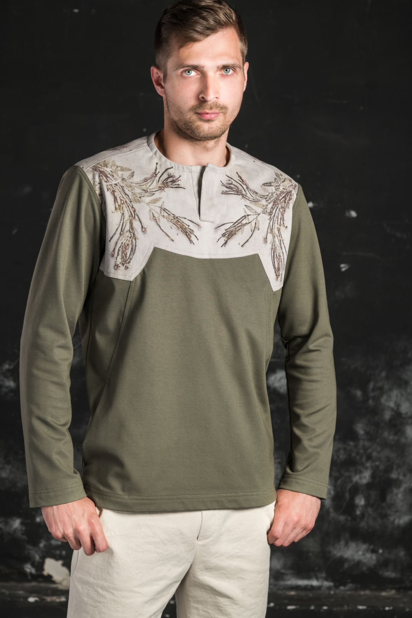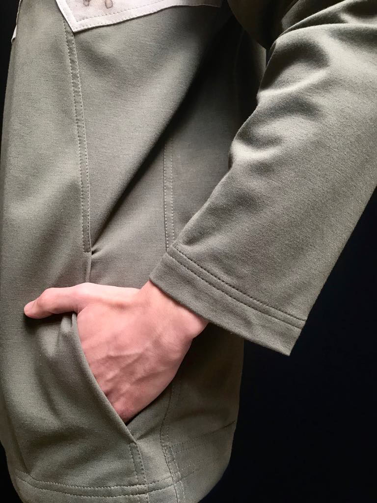Pánská mikina z úpletu zelené barvy s kontrastním sedlem z bavlněného kepru potištěného technikou ecoprint. Na sedle je vidět otisk Vrbovky úzkolisté. Všitá léga do sedla na předním dílu o délce 11 cm umožňuje snadné oblékání a je zároveň zdobným prvkem. Do členících švů na předním díle jsou všity kapsy. Mikina je vhodná na běžné denní nošení. Návod k údržbě vždy obdržíte společně s produktem.
