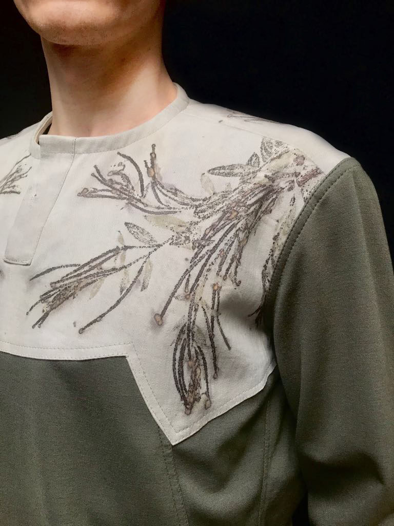 ECOPRINT: Jde o techniku ručního tisku na textilní materiál za pomoci rostlin. Každý materiál, byť je například barven stejnými postupy, má nakonec odlišný vzhled. Proto je každý výrobek z tohoto materiálu neopakovatelný originál.